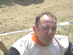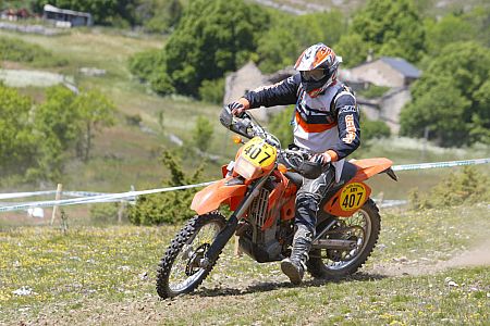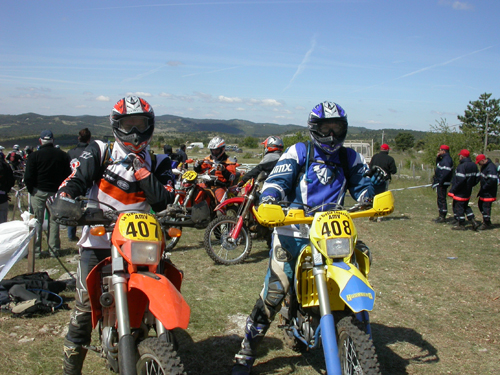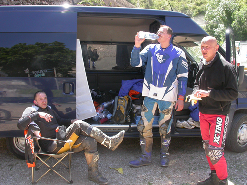 Und es ging... da wir aber nun mal die vollen Schmerzen gebucht hatten, wollten wir auch die vollen Schmerzen haben. Am 2ten Servicepunkt wurde ich gefragt ob ich Fahrspaß habe, ich sagte nur, "FAHRSPASS? Hab ich nich", was sicherlich daraus begründet war, dass ich schließlich ohne Kraft- bzw. Konditionstraining an dieser Veranstaltung teilnehmen wollte. Sesselpupser halt - das rächt sich. Irgendwann waren wir dann am Ziel. Ich glaube es waren 203 km. Fast jede Etappe enthielt natürlich für die Vollgas-Fraktion noch Sonderprüfungen. Wir sagten uns - "smooth". So richtig weichgeklopft kamen wir am Ziel an, um die letzte Sonderprüfung für diesen Tag, am La Vabre, zu durchfahren. Ich glaube, Bestzeit ging nicht mehr. Anschließend noch nach den Mopeten geschaut und ab in den Park Ferme damit. Ich glaube ich war, alle Anwesenden konnten das bestätigen, nicht mehr gut drauf - k örperlich. Es reichte gerade noch für ne Vase und Körperpflege. Dann der 2te Tag. Das Aufstehen ging verhältnismäßig gut. Ich wunderte mich schon. Alles geschmeidig. Alle Stellen, die auf jeden Fall hätten weh tun müssen, wurden ja von der Hirschtalg-Kur im Zaum gehalten. Nun ging es wieder zum Park Ferme, Startrampe (Lautsprecheransage mit immer neuen Variationen unserer Namen), Etappen, Sonderprüfungen.