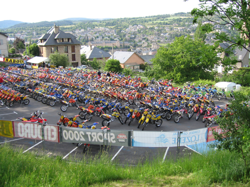 Bevor es bei so einer Veranstaltung los gehen kann, sind natürlich noch einige Dinge zu erledigen. Zuerst einmal muss die Mopete auf Vordermann gebracht werden und mit den guten Michelins und Moose bestückt werden. Dies erledigten wir in unserem Fahrerlager auf dem Camping Platz in Mende (Tivoli Capming). Da wir ja schon ein paar Tage vorher angereist waren, um Land und Leute mit dem Trial Moped kennen zu lernen kreuzten wir auch ein paar Steckenabschnitte der Trefle - natürlich rein zufällig. Die Mopeten nun auf Vordermann gebracht, konnten wir uns entspannt am Donnerstag zum Einschreiben und zur Technischen Abnahme begeben. Hier standen wir in Reih und Glied um dann einer nach dem anderen die Tageslizenz, Haftungsverzichtserklärung sowie die Fahrzeugpapiere zu checken. Desweiteren gab es noch für jeden Teilnehmer einen Transponder für die Zeitmessung wärend der Veranstaltung - gegen 200€ Kaution. Natürlich hatten wir keine 200€ in Bar dabei - es gingen zwar auch Schecks, aber wer hat heute noch sowas.... Also flucks zum Bankomat um dann wieder brav anstellen. Nach der Anmeldung gings mit den Mopeten und dem neuen Helm zur technischen Abnahme. Anschließend, natürlich nur wenn alles OK war, wurden die Mopeten im Park Ferme mit gaaaanz vielen Anderen auf einem großen Parkplatz abgestellt.