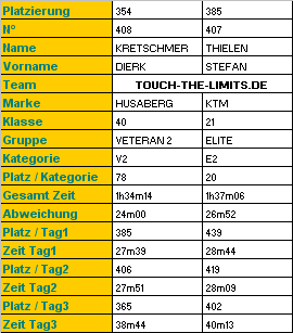 Am Ziel warteten schon die Groopies auf uns. Raunen ging durch die Menge. Wir hatten es geschafft. Ja, natürlich tat uns alles weh. Aber wir waren durch, und dabei, und ohne Schäden an Mensch und Maschine. Ein tolles Gefühl. Und beim nächsten Mal wird das Ziel vielleicht, vielleicht ein bisschen höher gesteckt. Unser Dank geht an unser Touch-The-Limits Service Team Tanja und Thomas. Die uns an jedem Servicepunkt umsorgt haben. Und natürlich an die Veranstalter und deren Helfer der TREFLÈ, die eine der schönsten Enduroveranstaltungen in Europa Jahr für Jahr organisieren und durchführen. Gruß Stefan
